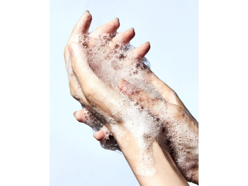 - Přidejte malé množství vody a napěňte gel v dlaních, dokud nevznikne jemná a lehká pěna.