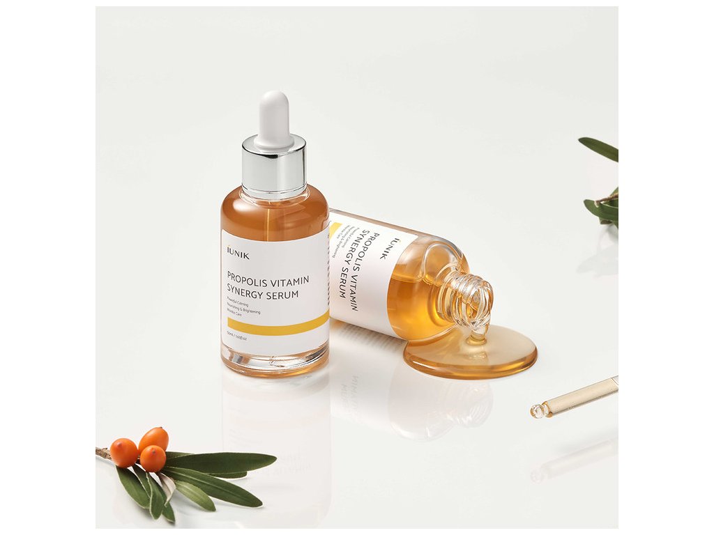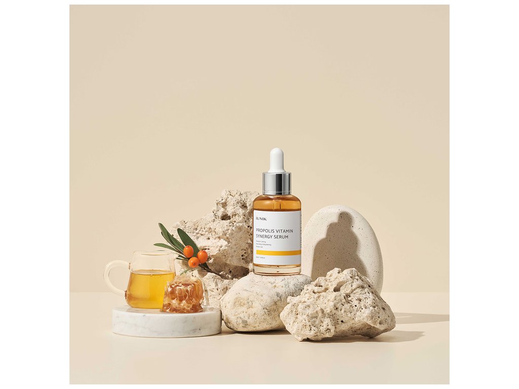 iUNIK Propolis Vitamin Synergy Serum je multifunkční sérum, které kombinuje sílu přírody a vědy pro komplexní obnovu a rozjasnění pleti. S vysokým obsahem 70 % propolisového extraktu přináší intenzivní zklidnění, ochranu a výživu, zatímco 12 % extrakt z rakytníku řešetlákového, bohatý na vitamín C, dodává pleti energii a podporuje její přirozenou vitalitu.
